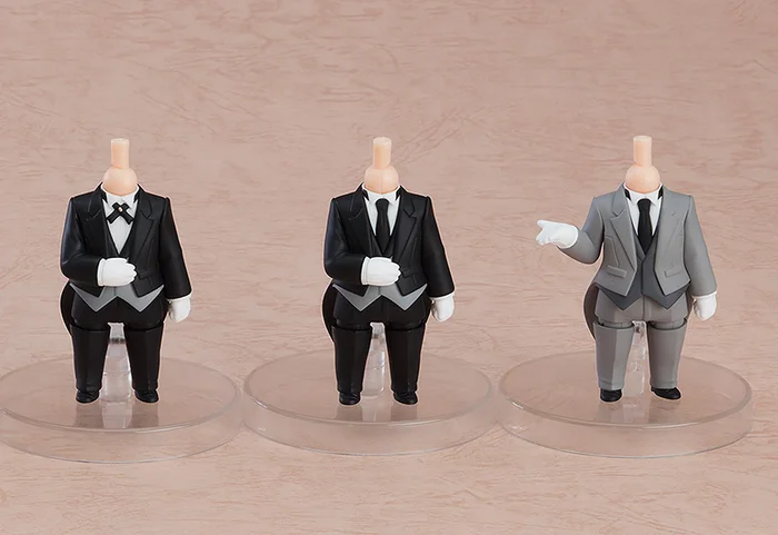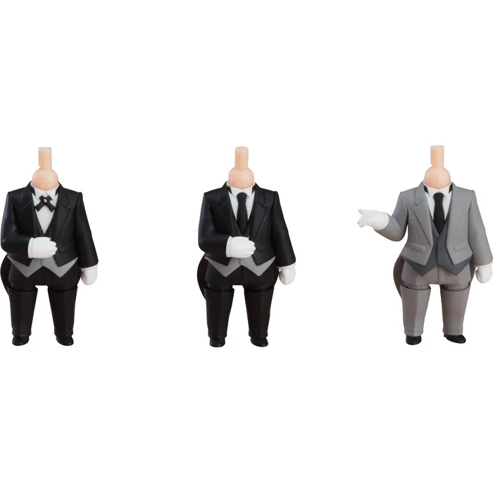 From the Nendoroid More line of fun accessories offering more ways to enjoy your Nendoroid figures comes a set to easily dress them up as a butler! Included are three outfits to choose from—a black suit with a ribbon tie and a gray and black suits with a necktie—each of which is in a gentlemanly pose. Just pop on a Nendoroid head and enjoy their new look!